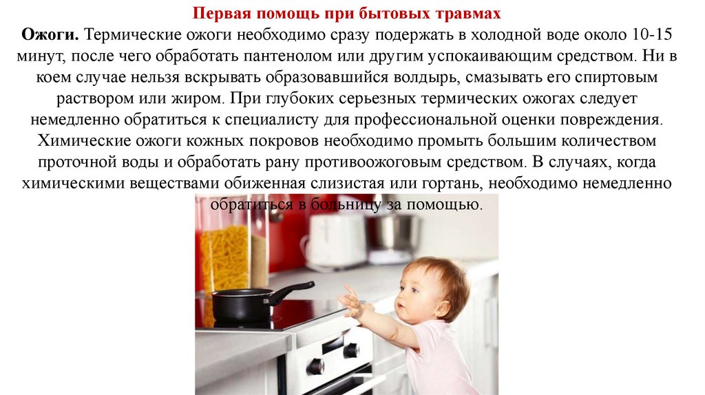 Первая помощь при бытовых травмахОжоги. Термические ожоги необходимо сразу подержать в холодной воде около 10-15