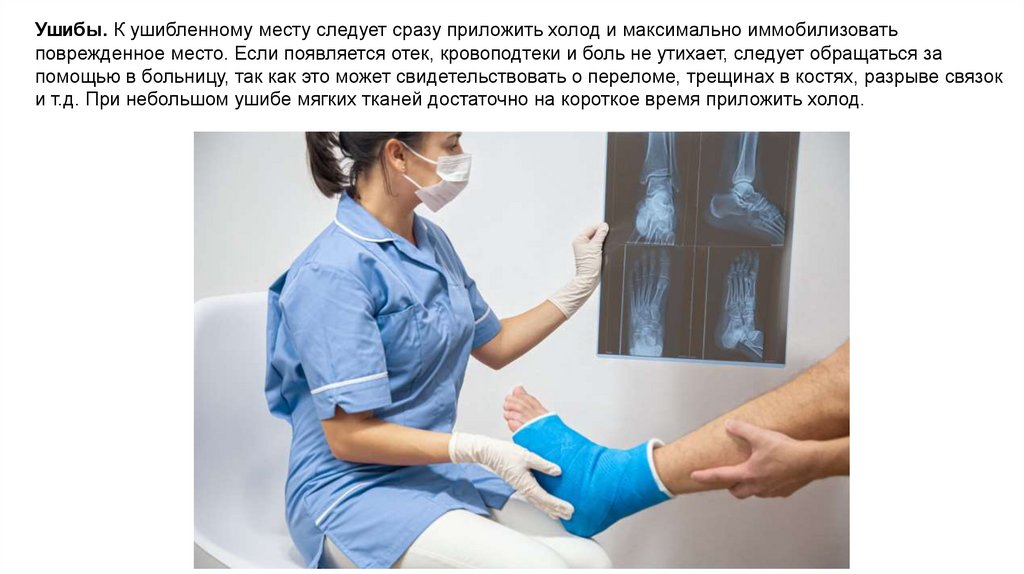 Ушибы. К ушибленному месту следует сразу приложить холод и максимально иммобилизоватьповрежденное место. Если появляется отек, кровоподтеки и боль не утихает, следует обращаться за