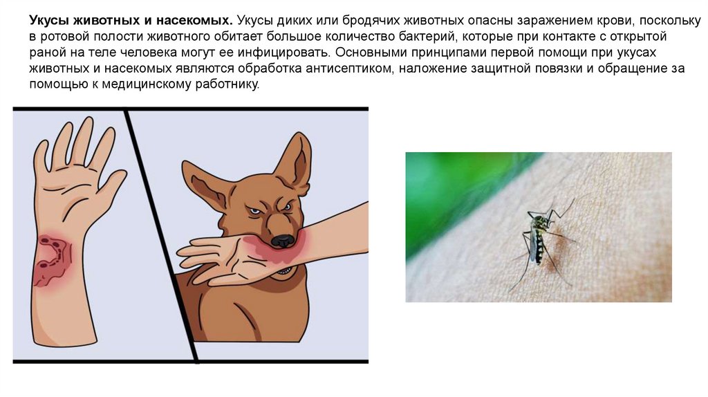 Укусы животных и насекомых. Укусы диких или бродячих животных опасны заражением крови, посколькув ротовой полости животного обитает большое количество бактерий, которые при контакте с открытой