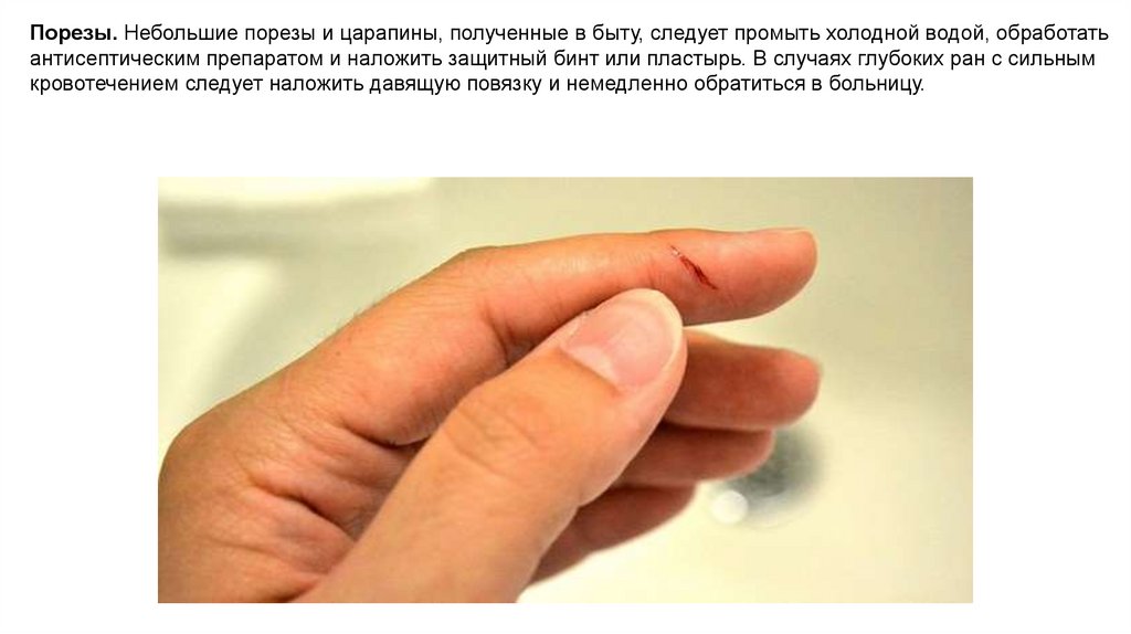 Порезы. Небольшие порезы и царапины, полученные в быту, следует промыть холодной водой, обработатьантисептическим препаратом и наложить защитный бинт или пластырь. В случаях глубоких ран с сильным