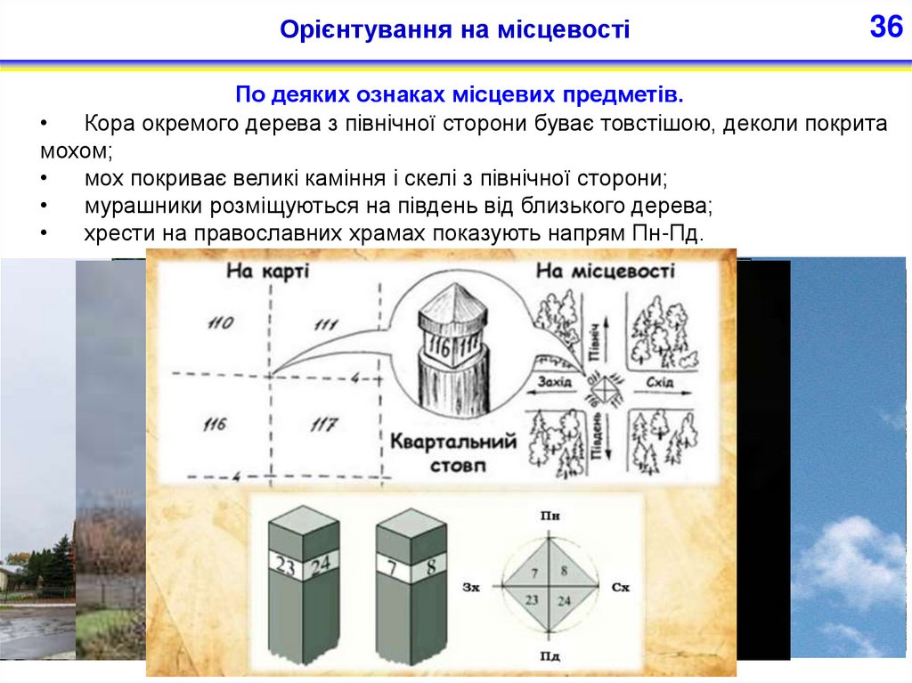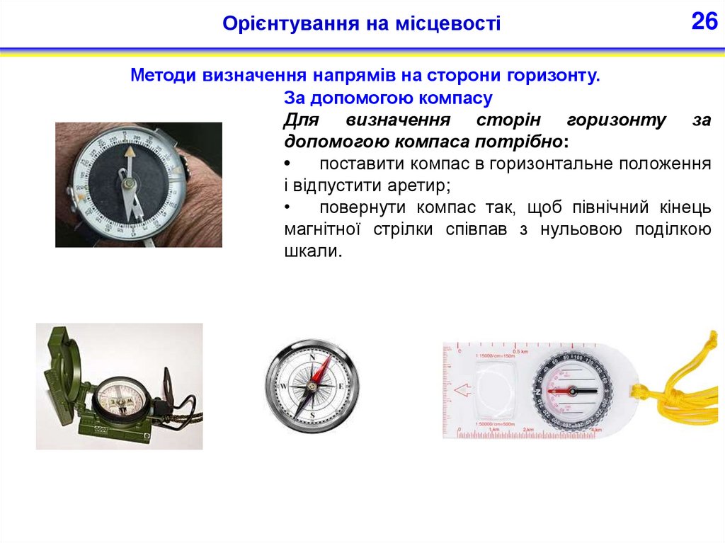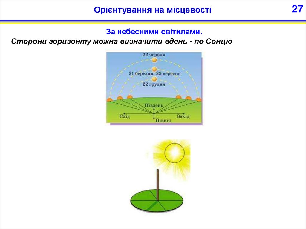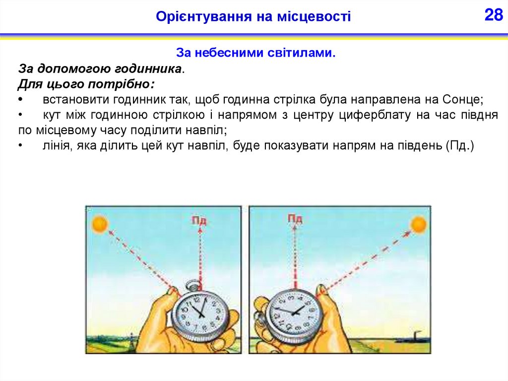 - знаходження і визначення сторін горизонту, потрібних напрямів на