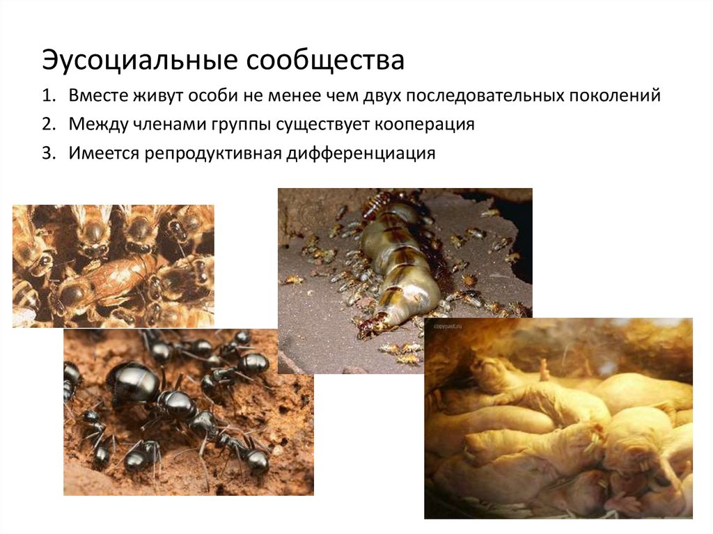 Эусоциальные сообщества1. Вместе живут особи не менее чем двух последовательных поколений