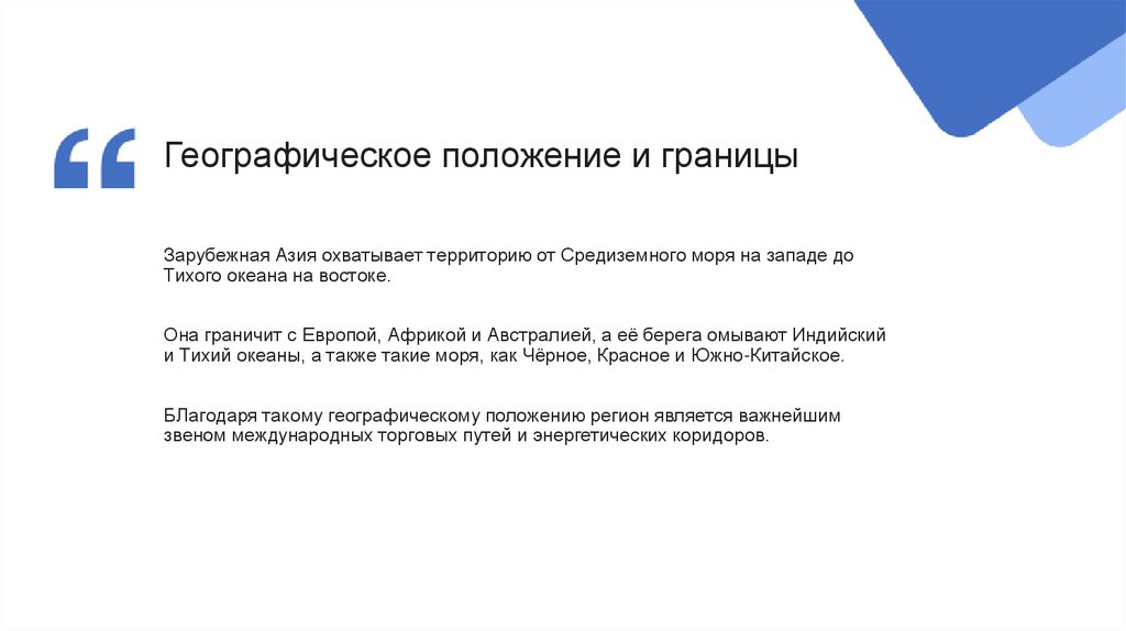 Географическое положение и границыЗарубежная Азия охватывает территорию от Средиземного моря на западе до