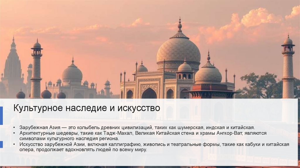 Культурное наследие и искусство• Зарубежная Азия — это колыбель древних цивилизаций, таких как шумерская, индская и китайская.
