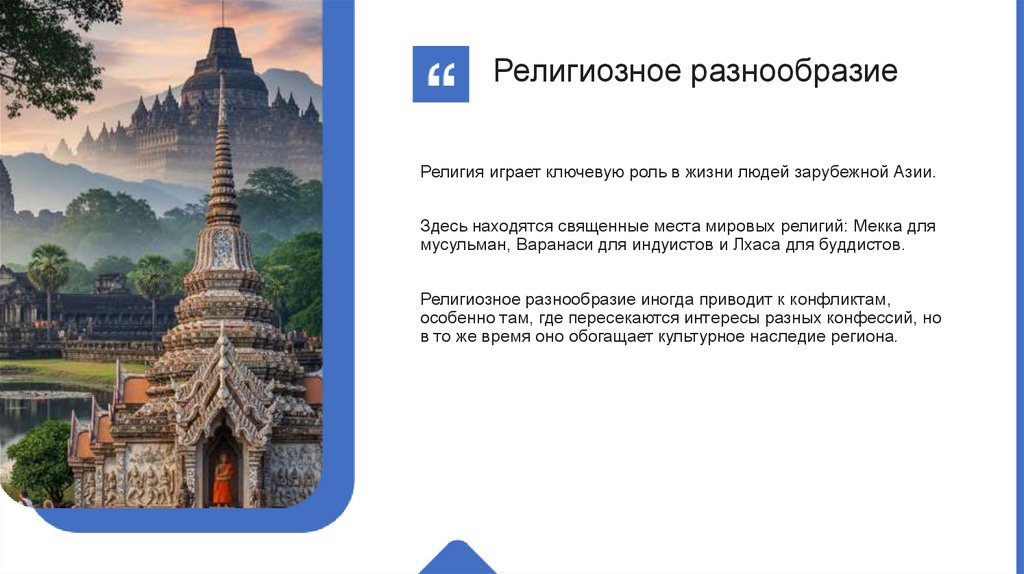Религиозное разнообразиеРелигия играет ключевую роль в жизни людей зарубежной Азии.