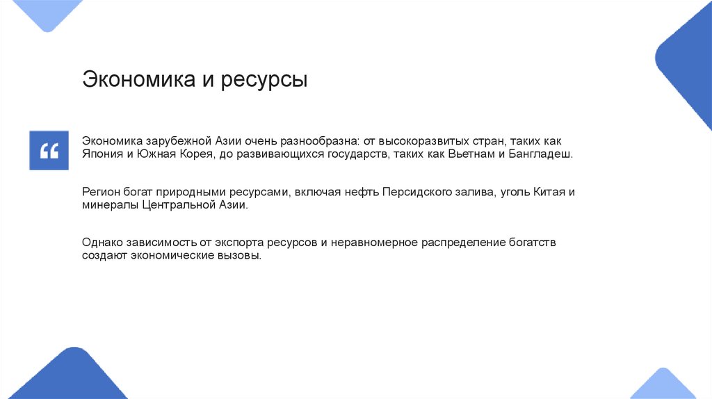 Экономика и ресурсыЭкономика зарубежной Азии очень разнообразна: от высокоразвитых стран, таких как