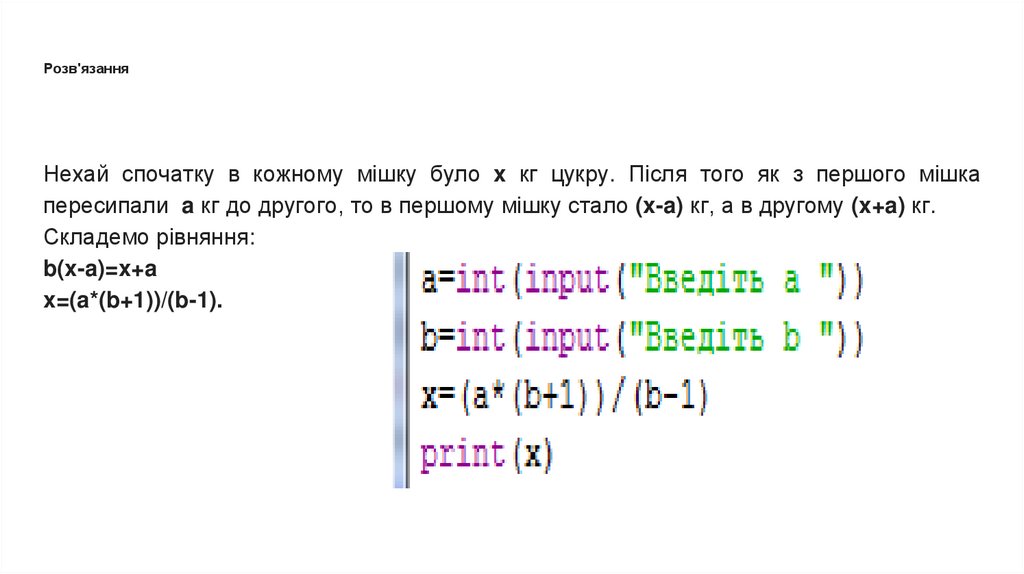 Вихідні дані: на екран виводиться одне число - шукана кількість кілограмів цукру в кожному мішку.