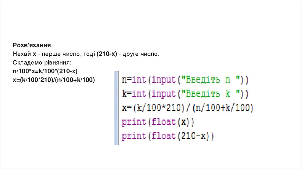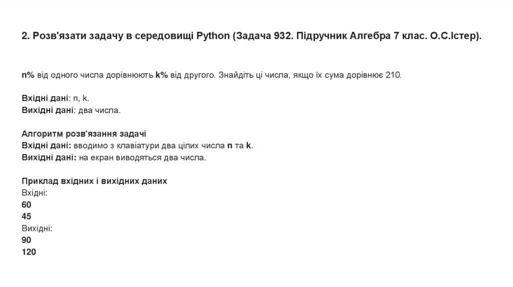 2. Розв'язати задачу в середовищі Python (Задача 932. Підручник Алгебра 7 клас. О.С.Істер).n% від одного числа дорівнюють k% від другого. Знайдіть ці числа, якщо їх сума дорівнює 210.