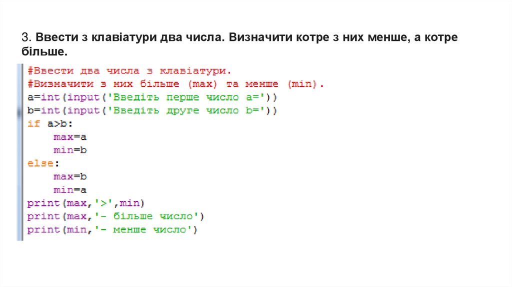 3. Ввести з клавіатури два числа. Визначити котре з них менше, а котребільше.