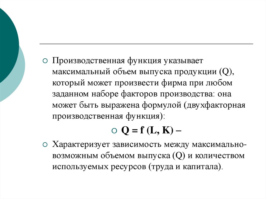 Производственная функция указываетмаксимальный объем выпуска продукции (Q),