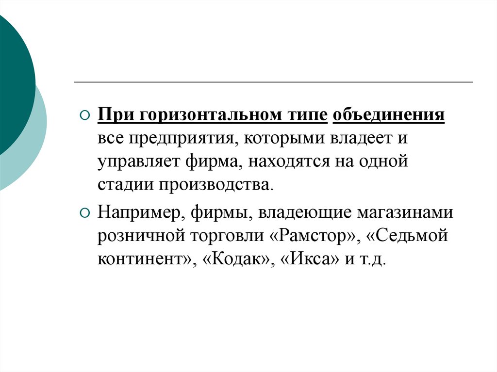 При горизонтальном типе объединениявсе предприятия, которыми владеет и