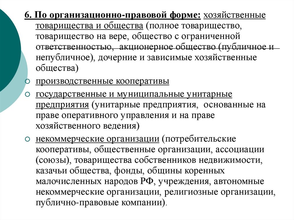6. По организационно-правовой форме: хозяйственныетоварищества и общества (полное товарищество,