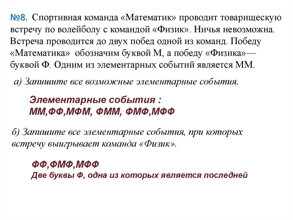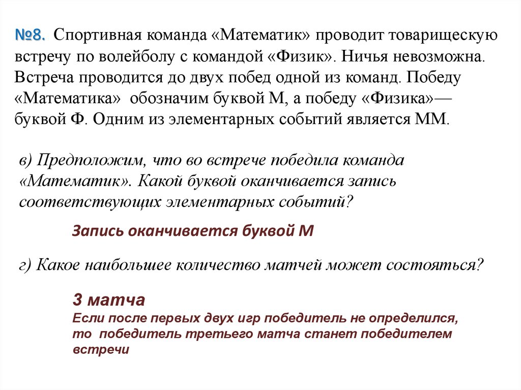 №8. Спортивная команда «Математик» проводит товарищескуювстречу по волейболу с командой «Физик». Ничья невозможна.