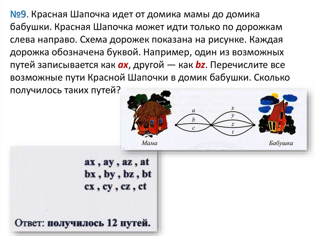 №9. Красная Шапочка идет от домика мамы до домикабабушки. Красная Шапочка может идти только по дорожкам