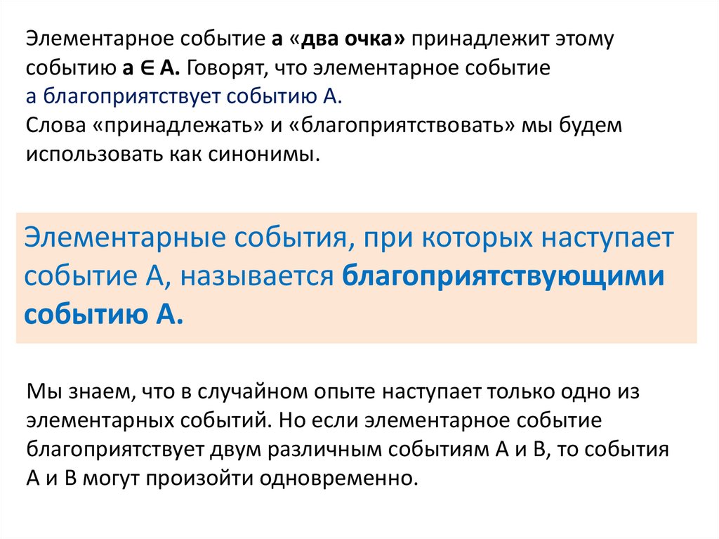 Элементарное событие a «два очка» принадлежит этомусобытию а ∈ А. Говорят, что элементарное событие
