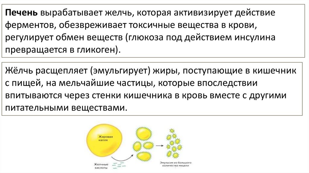 Жёлчь расщепляет (эмульгирует) жиры, поступающие в кишечник