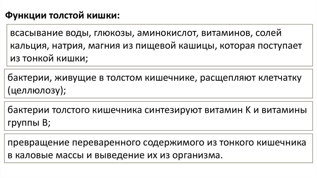 Функции толстой кишки:всасывание воды, глюкозы, аминокислот, витаминов, солей