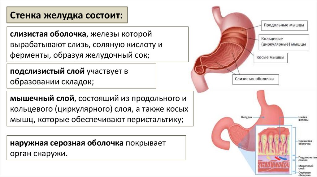 Стенка желудка состоит:слизистая оболочка, железы которой