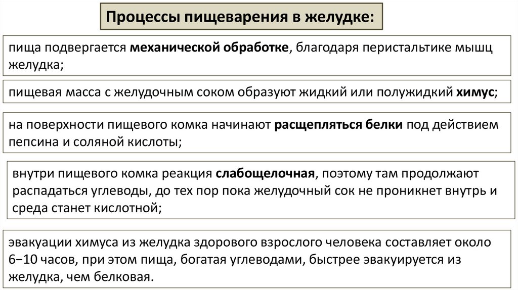 Процессы пищеварения в желудке:пища подвергается механической обработке, благодаря перистальтике мышц