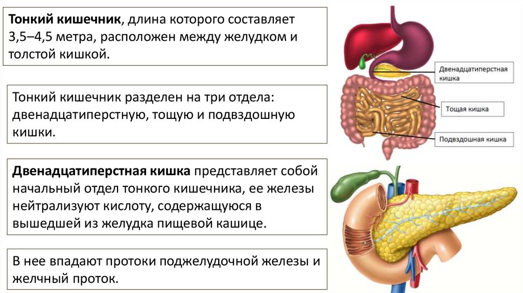 Тонкий кишечник, длина которого составляет3,5–4,5 метра, расположен между желудком и