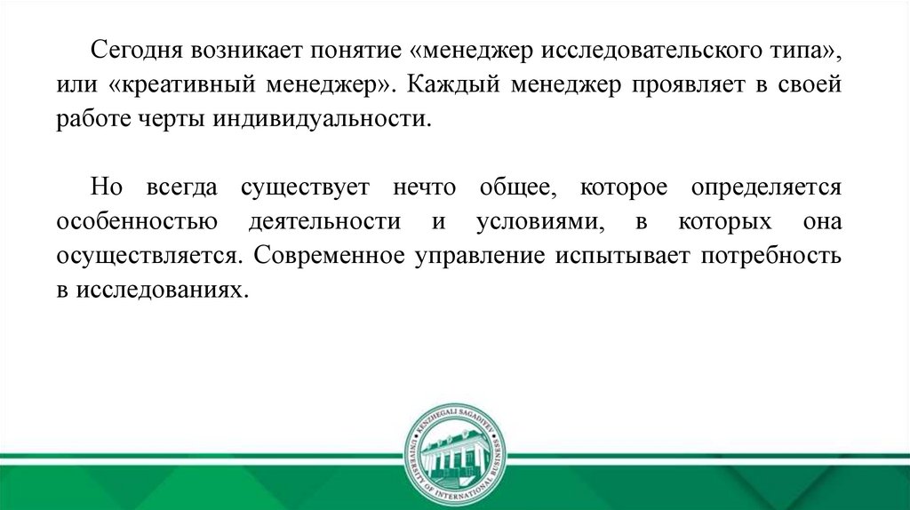 Сегодня возникает понятие «менеджер исследовательского типа»,или «креативный менеджер». Каждый менеджер проявляет в своей
