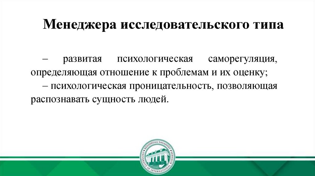 Менеджера исследовательского типа– развитая психологическая саморегуляция,