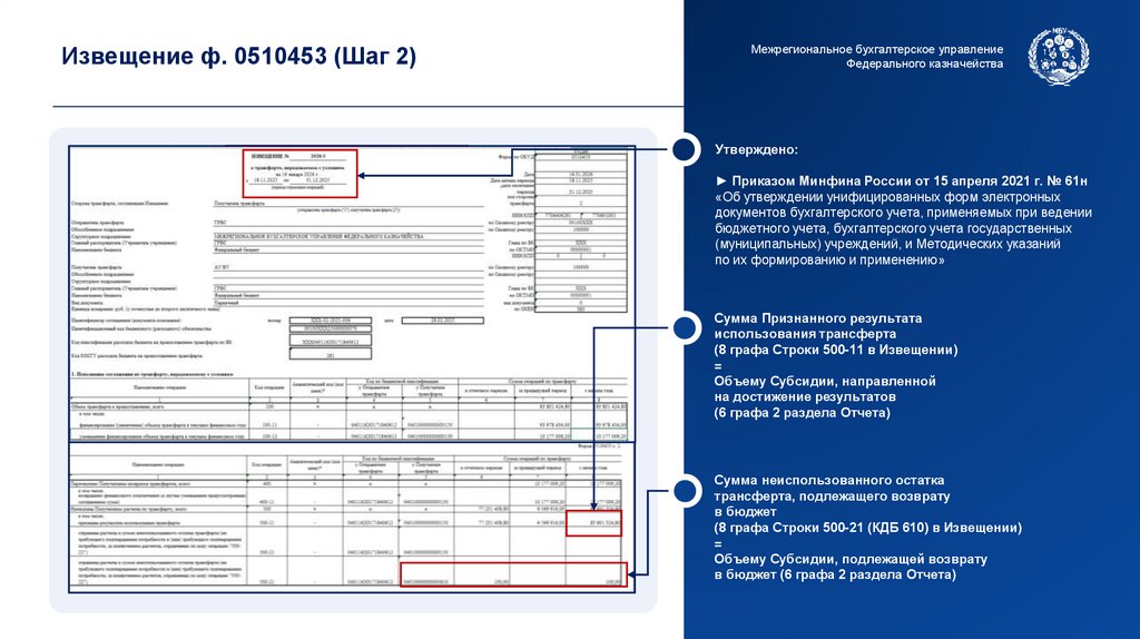 Извещение ф. 0510453 утверждено Приказом Минфина России от 15 апреля 2021 г. № 61н «Об утверждении унифицированных форм