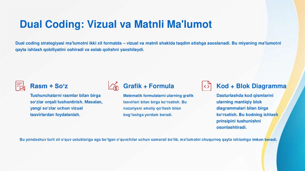 materialning taqdim etilishi va o'quvchining shaxsiy xususiyatlari