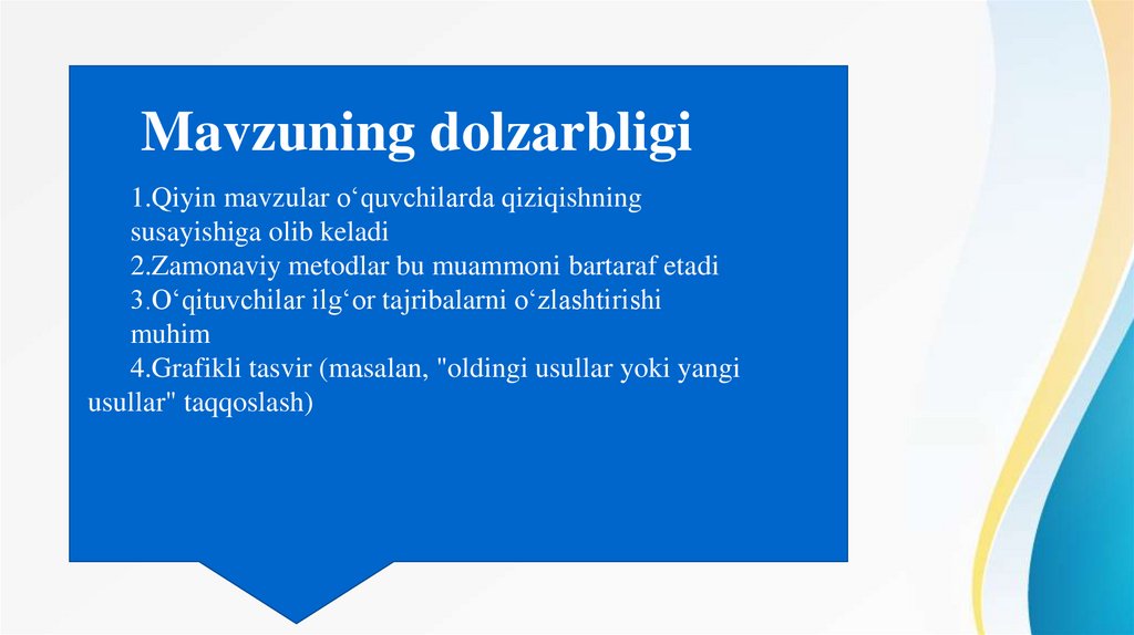 Mavzuning dolzarbligi1.Qiyin mavzular o‘quvchilarda qiziqishning