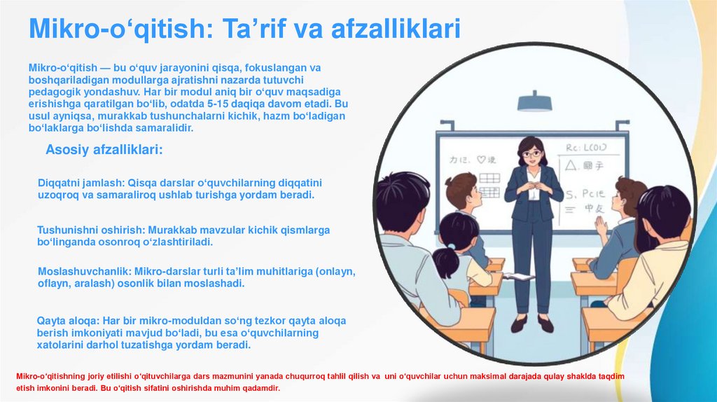Mikro-o‘qitish: Taʼrif va afzalliklariMikro-o‘qitish — bu o‘quv jarayonini qisqa, fokuslangan va