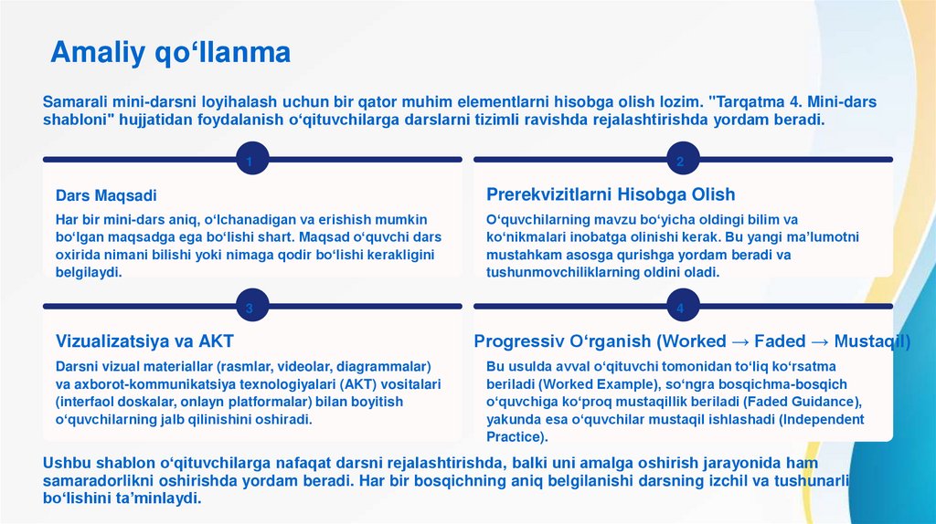 Amaliy qo‘llanmaSamarali mini-darsni loyihalash uchun bir qator muhim elementlarni hisobga olish lozim. "Tarqatma 4. Mini-dars