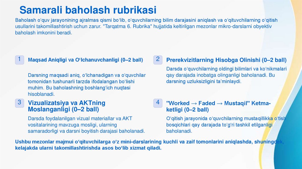 usullarini takomillashtirish uchun zarur. "Tarqatma 6. Rubrika" hujjatida keltirilgan mezonlar mikro-darslarni obyektiv