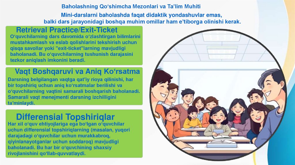 Baholashning Qo‘shimcha Mezonlari va Taʼlim MuhitiMini-darslarni baholashda faqat didaktik yondashuvlar emas,
