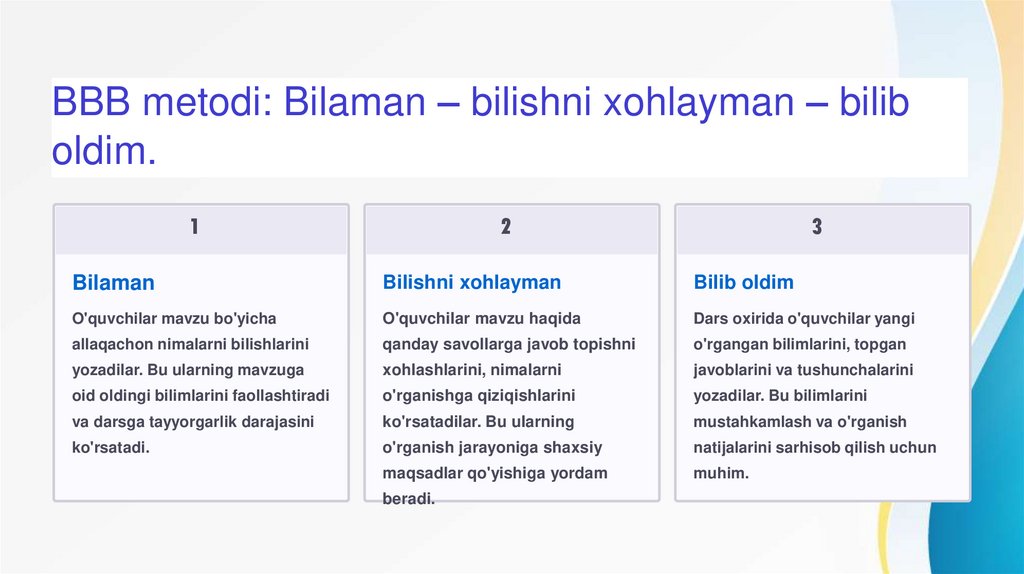samaradorlikni oshirishda yordam beradi. Har bir bosqichning aniq belgilanishi darsning izchil va tushunarli