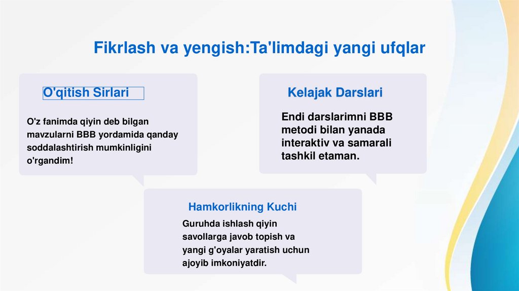 ko‘nikmalari inobatga olinishi kerak. Bu yangi maʼlumotni