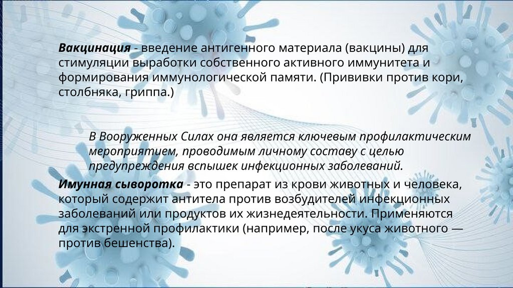 Вакцинация - введение антигенного материала (вакцины) длястимуляции выработки собственного активного иммунитета и