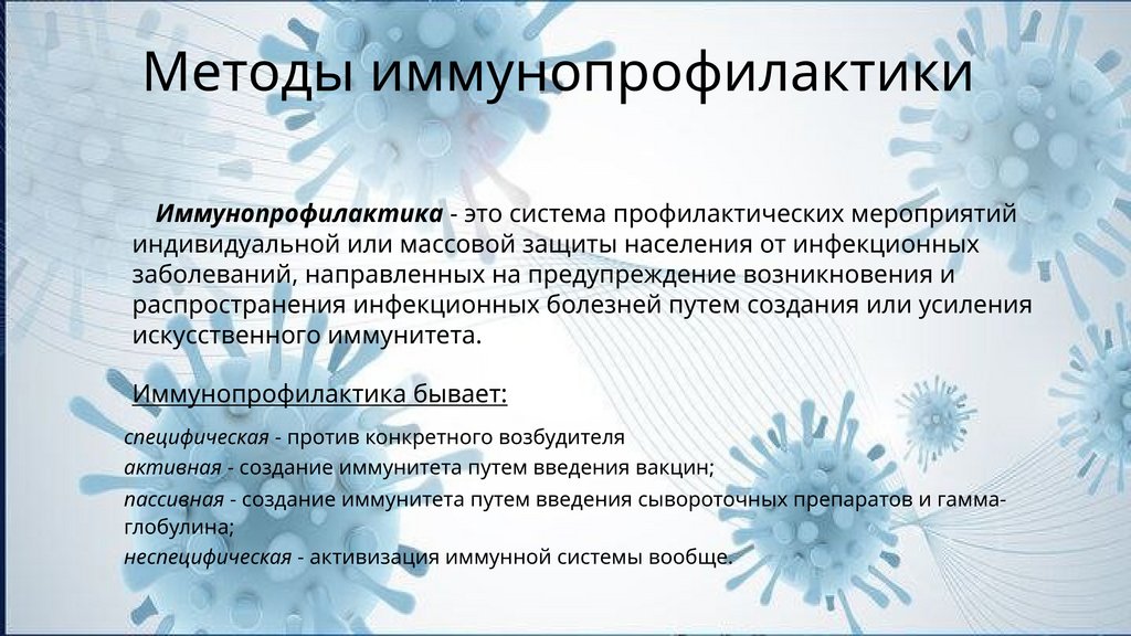 Методы иммунопрофилактикиИммунопрофилактика - это система профилактических мероприятий