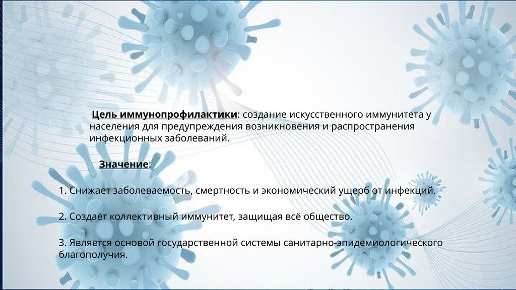 Цель иммунопрофилактики: создание искусственного иммунитета унаселения для предупреждения возникновения и распространения