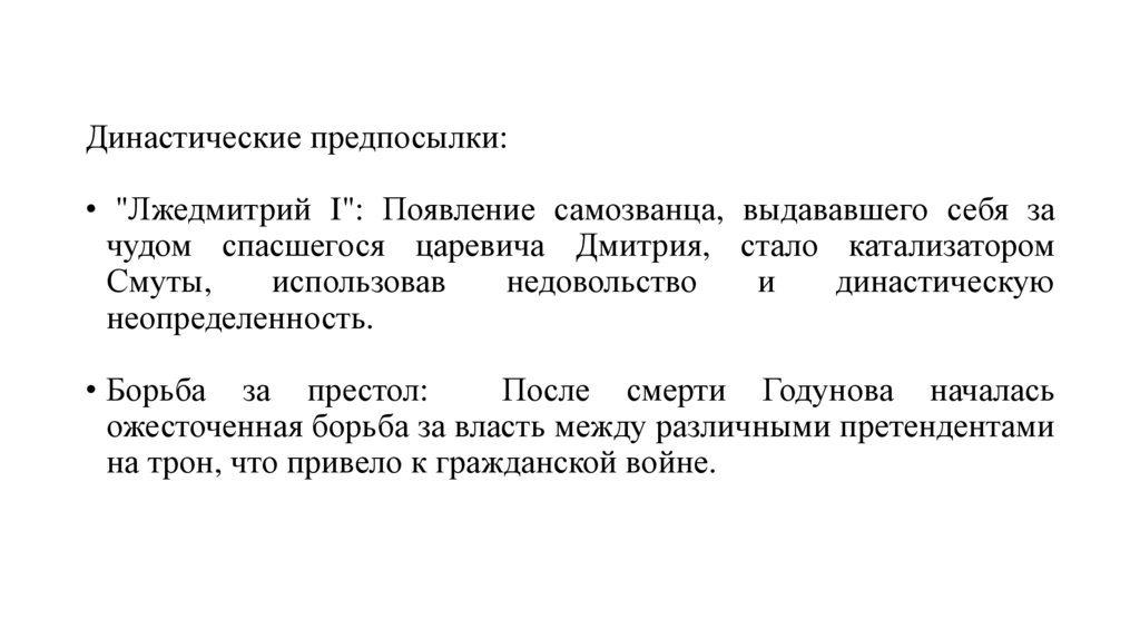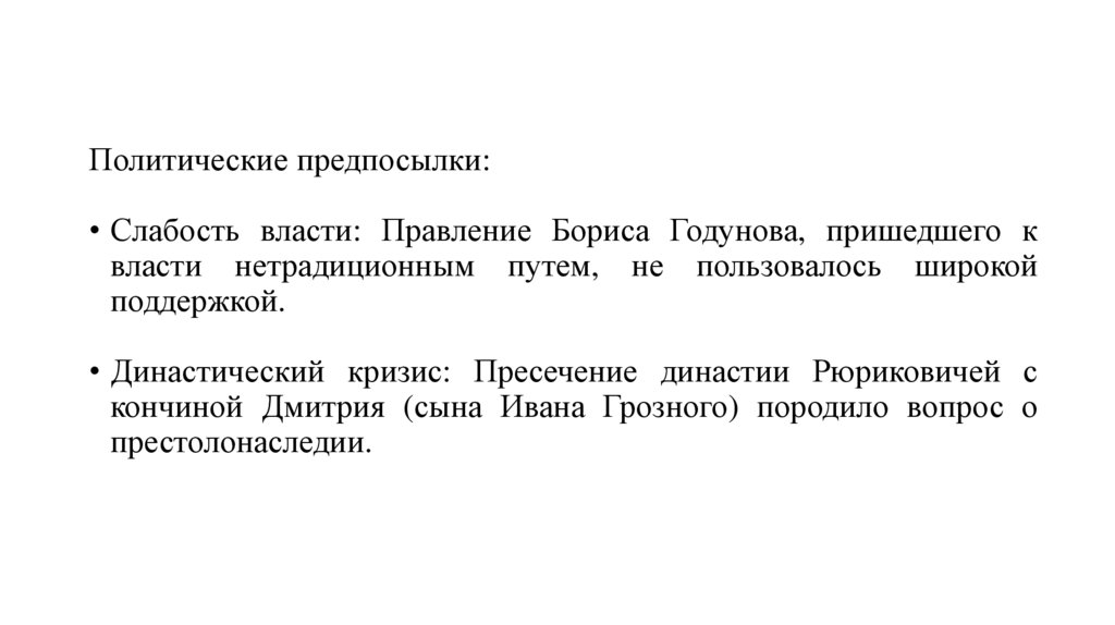 Политические предпосылки:• Слабость власти: Правление Бориса Годунова, пришедшего к