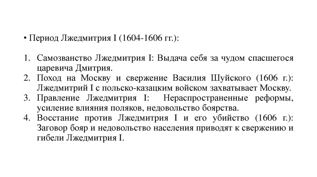 • Период Лжедмитрия I (1604-1606 гг.):1. Самозванство Лжедмитрия I: Выдача себя за чудом спасшегося
