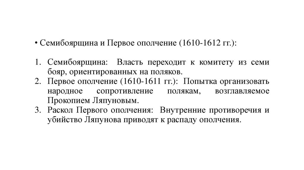 • Семибоярщина и Первое ополчение (1610-1612 гг.):1. Семибоярщина: Власть переходит к комитету из семи