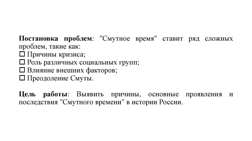 Постановка проблем: "Смутное время" ставит ряд сложныхпроблем, такие как: