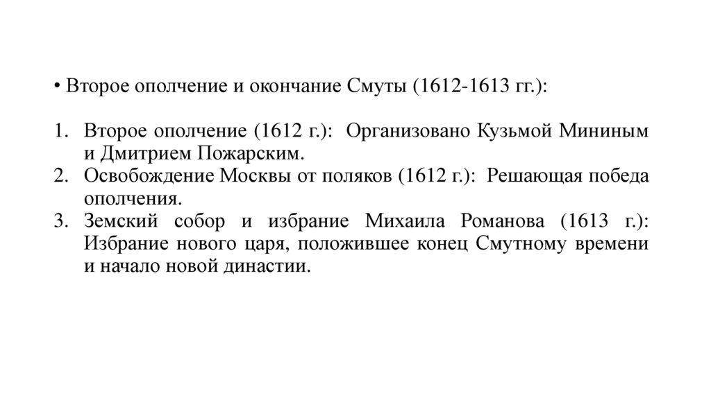 • Второе ополчение и окончание Смуты (1612-1613 гг.):1. Второе ополчение (1612 г.): Организовано Кузьмой Мининым