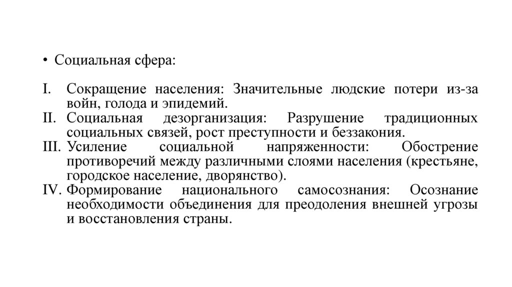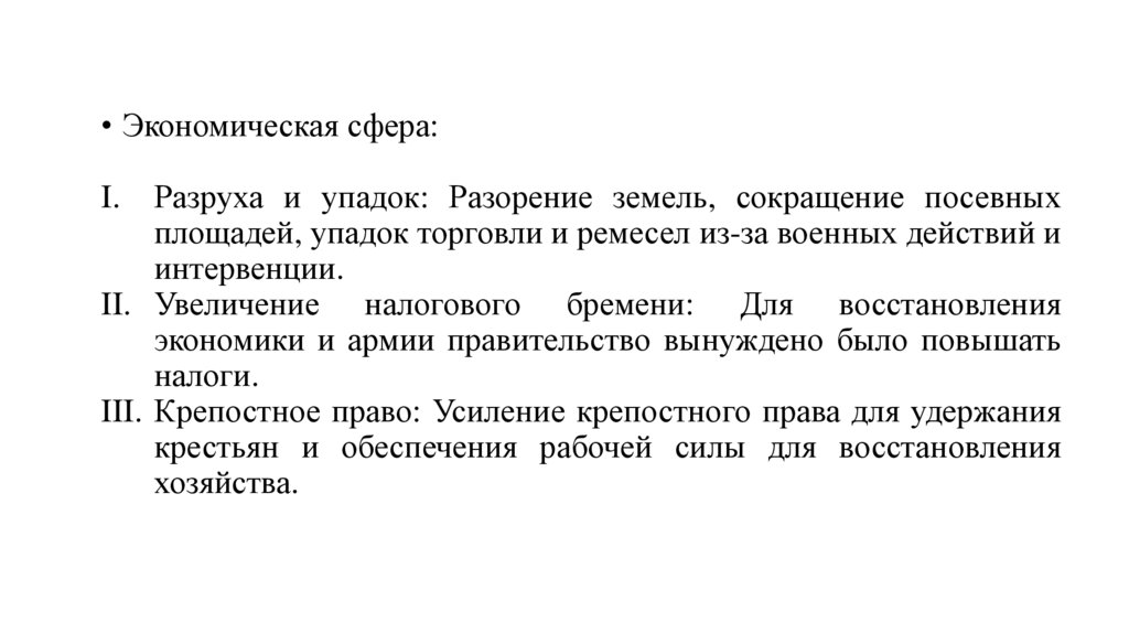 • Экономическая сфера:Разруха и упадок: Разорение земель, сокращение посевных