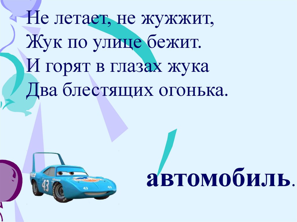 Не летает, не жужжит,Жук по улице бежит.