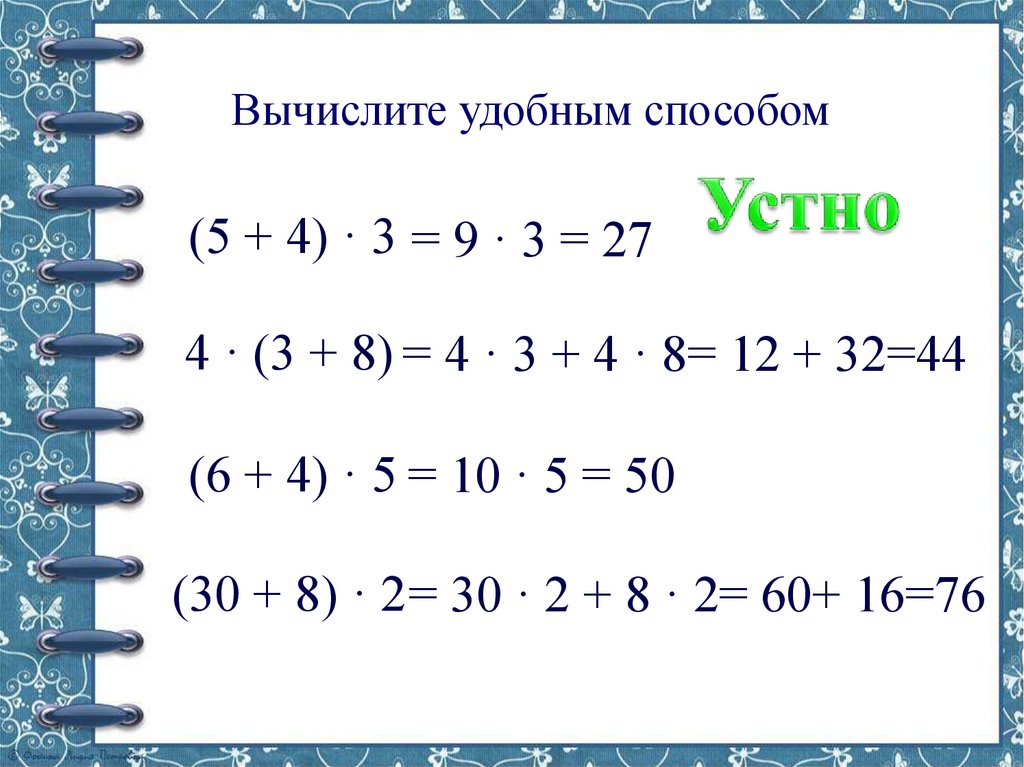 Вычислите удобным способом(5 + 4) · 3 = 9 · 3 = 27