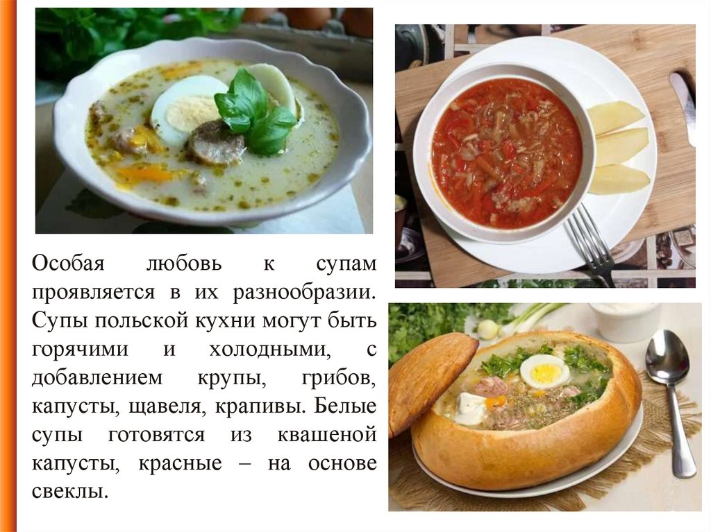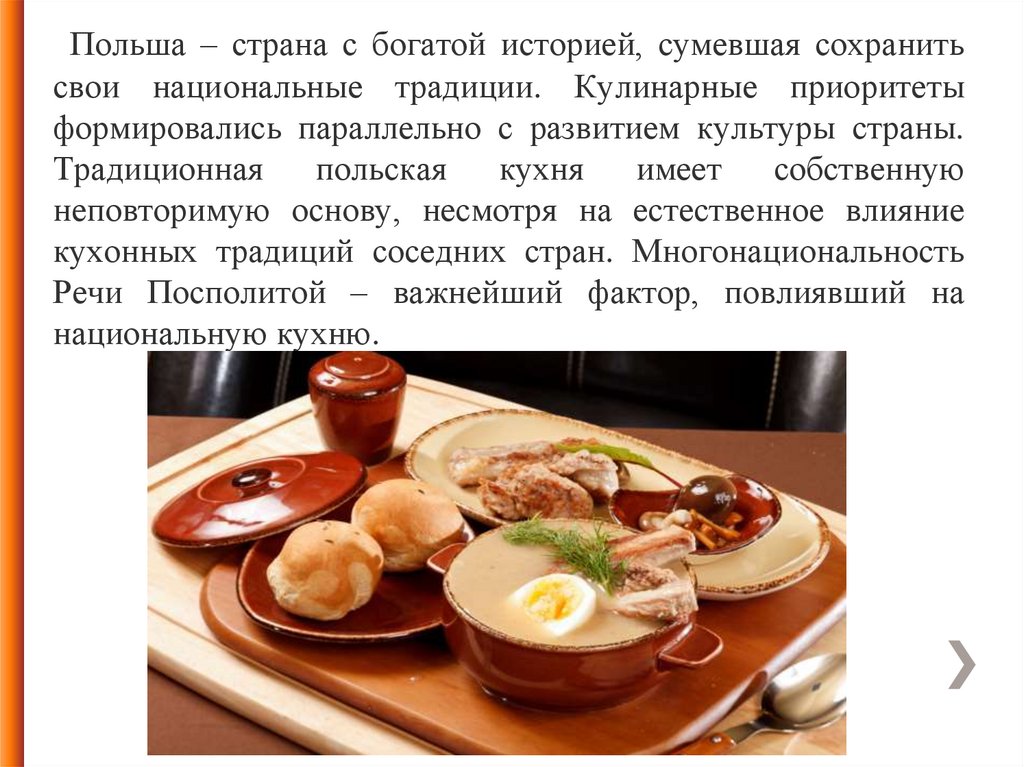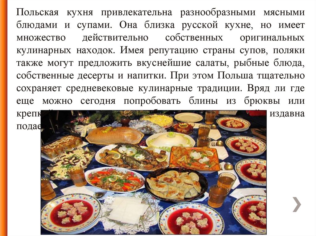 Польская кухня привлекательна разнообразными мяснымиблюдами и супами. Она близка русской кухне, но имеет