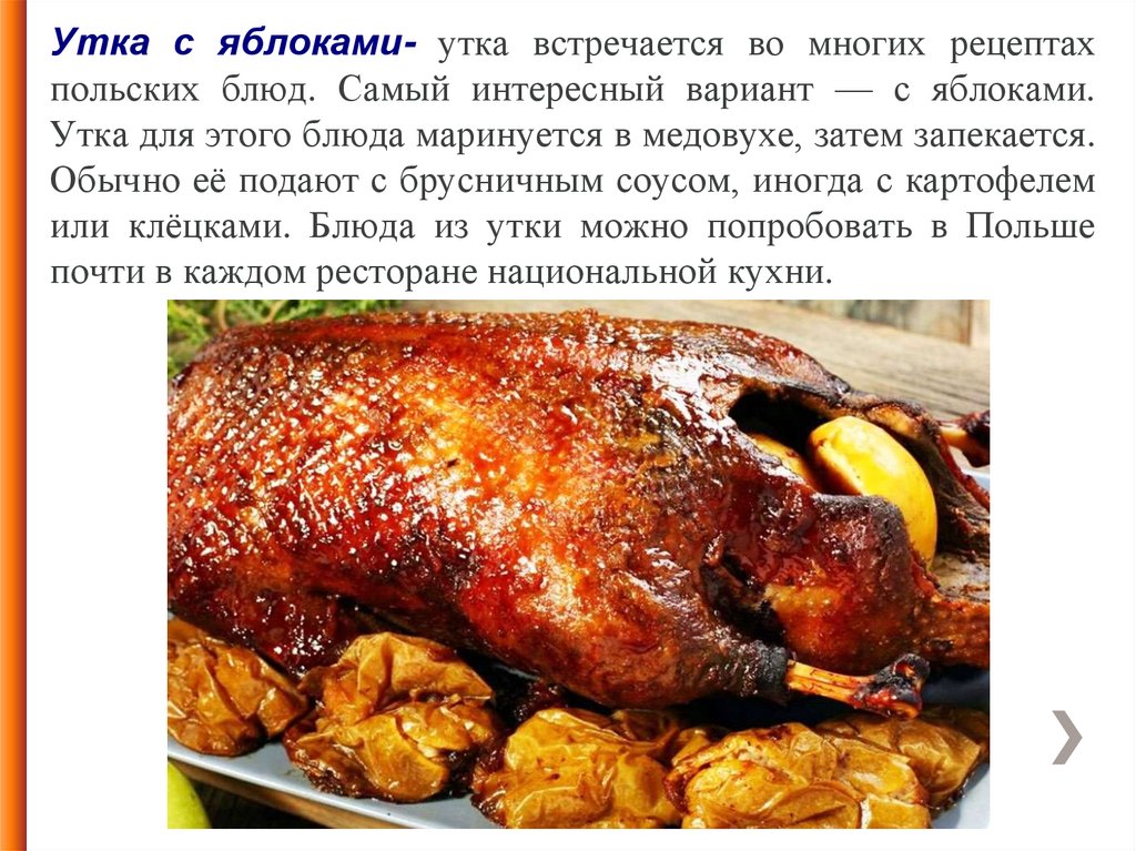 Утка с яблоками- утка встречается во многих рецептахпольских блюд. Самый интересный вариант — с яблоками.