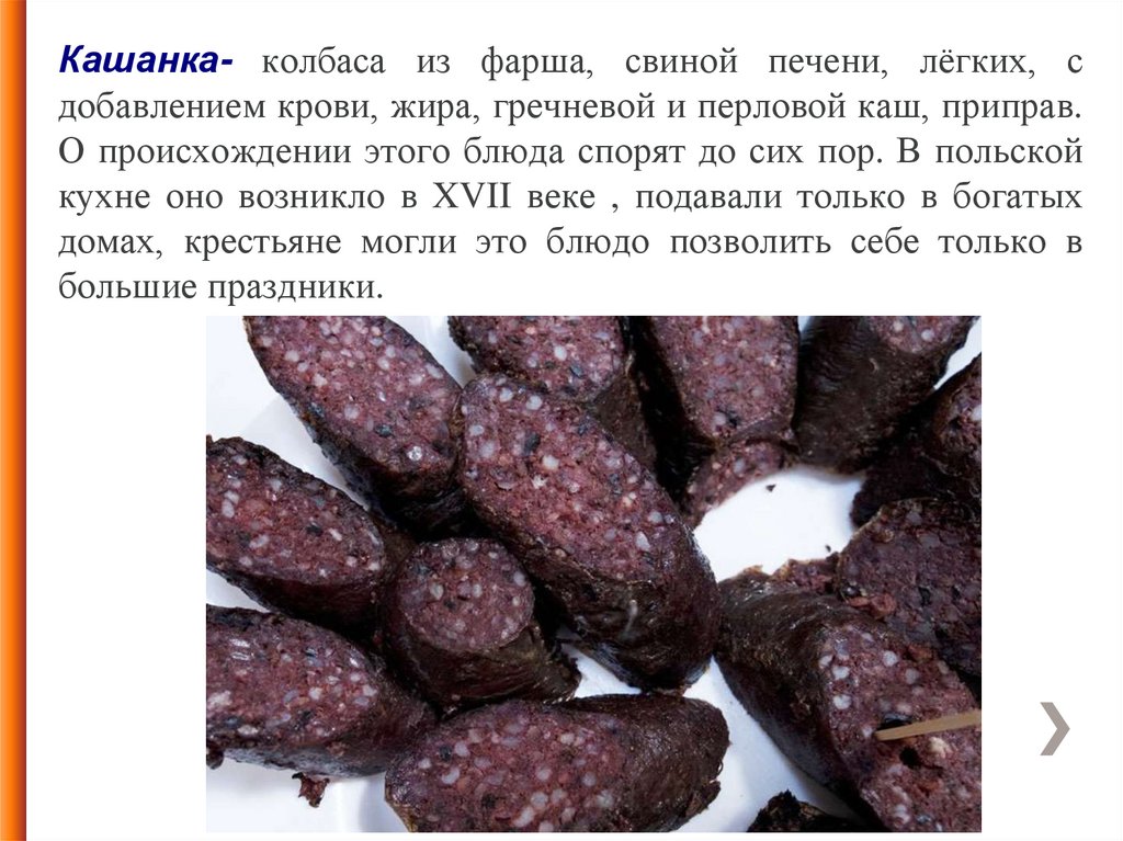 Кашанка- колбаса из фарша, свиной печени, лёгких, сдобавлением крови, жира, гречневой и перловой каш, приправ.