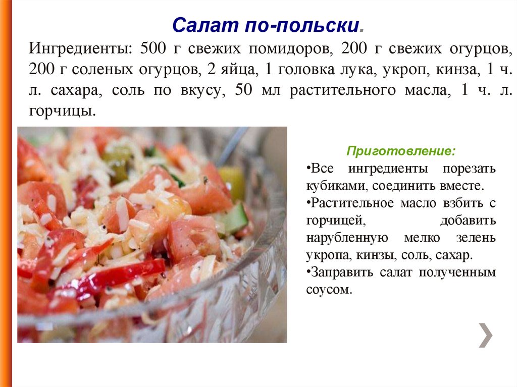 Салат по-польски.Ингредиенты: 500 г свежих помидоров, 200 г свежих огурцов,